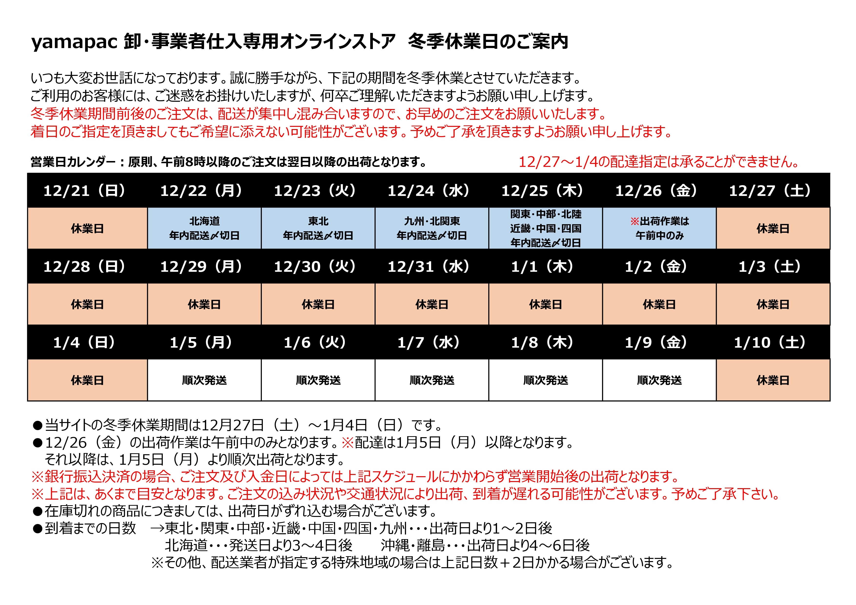 いつも大変お世話になっております。誠に勝手ながら、下記の期間を冬季休業とさせていただきます。